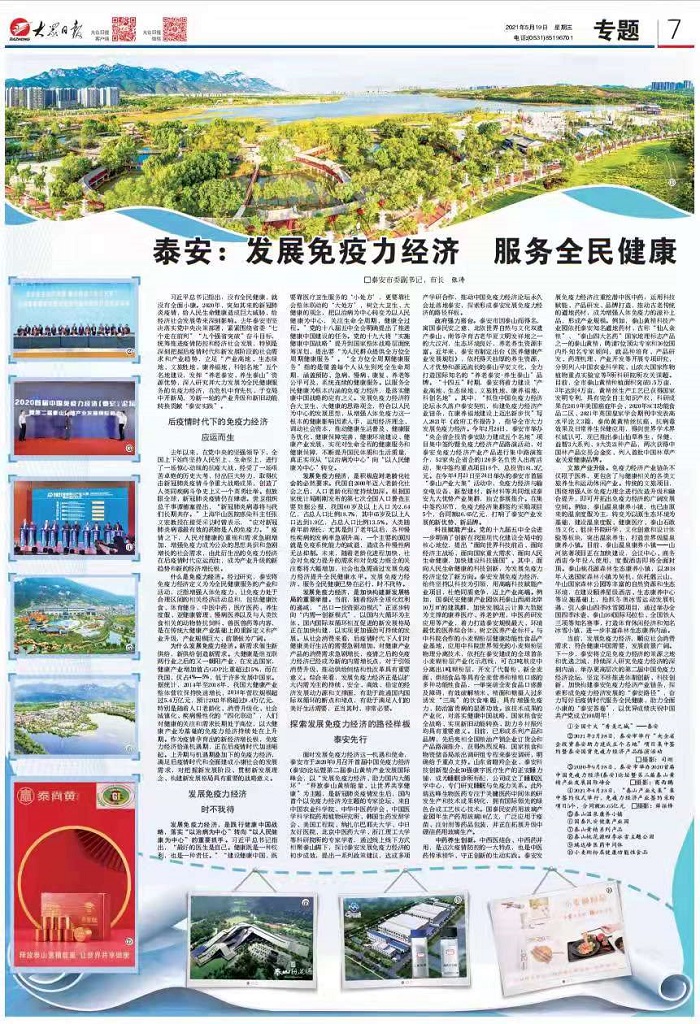 近日《大众日报》整版刊发张涛市长《泰安:发展免疫经济 服务全民健康》署名文章,全面阐述了后疫情时代发展免疫力经济的深刻内涵,介绍了泰安发展免疫力经济的路径经验,在全国范围内进一步打响了免疫力经济泰安品牌,为相关产业发展和项目招商合作塑造了新优势、创造了新机遇。