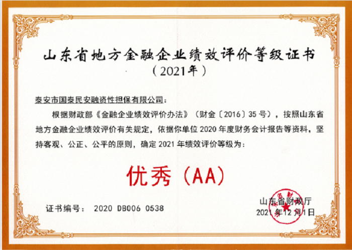 近日,山东省财政厅颁发了2021年山东省地方金融企业绩效评价等级证书,国泰民安担保公司在此次绩效评价中荣获“优秀(AA)”等级。