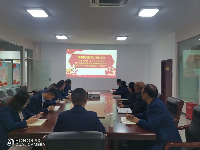 11月8日,国泰民安担保公司党支部召开专题会议,开展“两学一做”主题党日活动暨“争创佳绩庆盛会 砥砺奋进新时代”组织学习《习近平谈治国理政(第四卷)》。公司党支部书记、董事长吴雷钢主持会议,公司领导班子成员及全体员工参加会议。