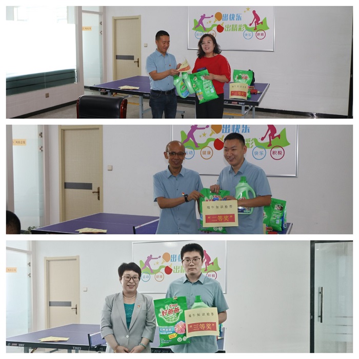 第二项内容为端午知识抢答,答对一题得一分,得错一题扣一分。吴董事长在端午节知识题库中随机抽取20个题目,所有员工摩拳擦掌、蓄势待发,伴随着一声声抢答拍桌子的声音,最终选出了三名得奖者。