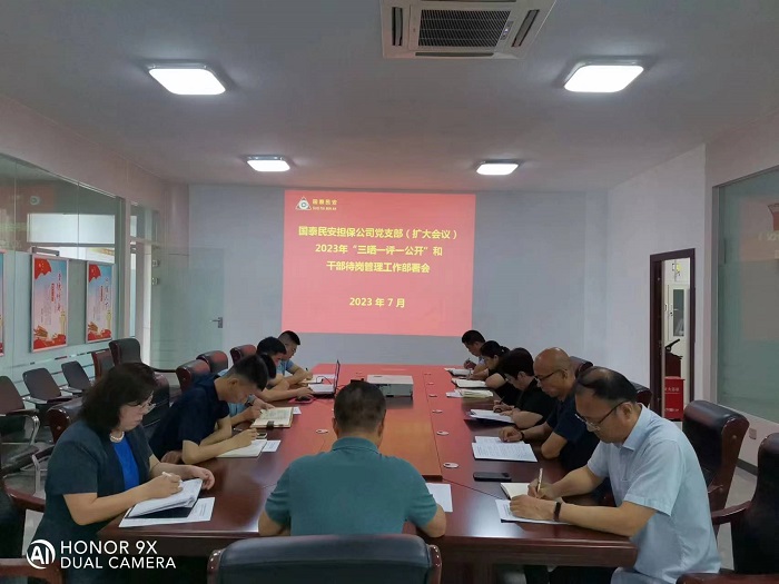 为推动“三晒一评一公开”活动有序开展,进一步激励干部履职尽责、担当作为、奋力争先。7月31日,国泰民安担保公司党支部召开了“三晒一评一公开”和干部待岗管理工作部署会,公司党支部书记、董事长吴雷钢主持会议,公司全体人员参会。