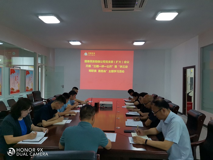 为推动“三个能力”提升行动走深走实,深入贯彻落实全市“学‘三定’、明职责、勇担当”活动要求,进一步明确职责分工,推动广大党员干部勇于担当、恪尽职守,营造干事创业良好氛围,8月4日,国泰民安担保公司党支部召开(扩大)会议开展“学‘三定’、明职责、勇担当”主题党日学习活动。公司党支部书记、董事长吴雷钢主持会议,公司全体员工参加学习。