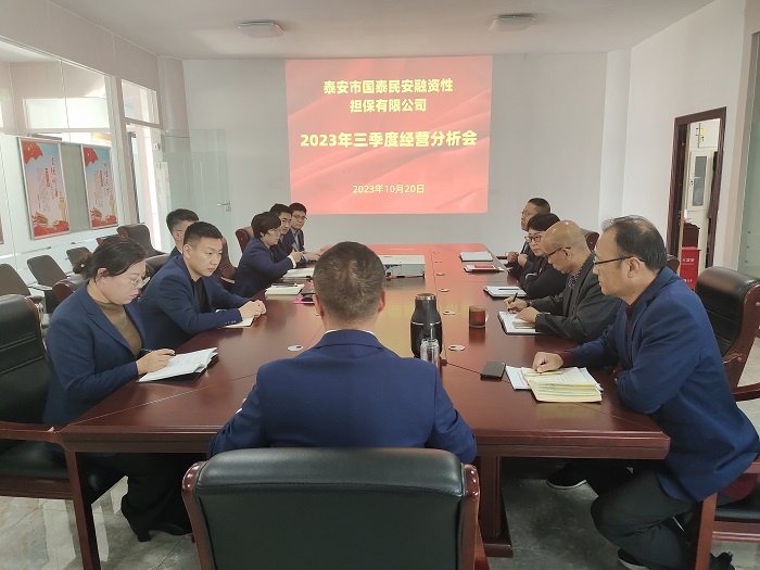 10月20日,国泰民安担保公司召开2023年度三季度经营分析会,公司领导班子及全体员工参加,总经理张宪民同志主持此次会议。