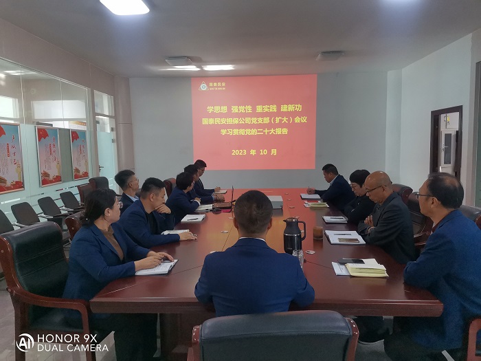 为深入学习贯彻党的二十大精神,凝心聚力推动企业高质量发展,10月20日,国泰民安担保公司党支部召开(扩大)会议开展“学习二十大精神,砥砺奋进新征程”主题党日活动,牢牢把握“学思想 强党性 重实践 建新功”的总要求,专题学习党的二十大报告。会议由公司党支部书记、董事长吴雷钢主持并讲话,公司全体党员干部参加学习。