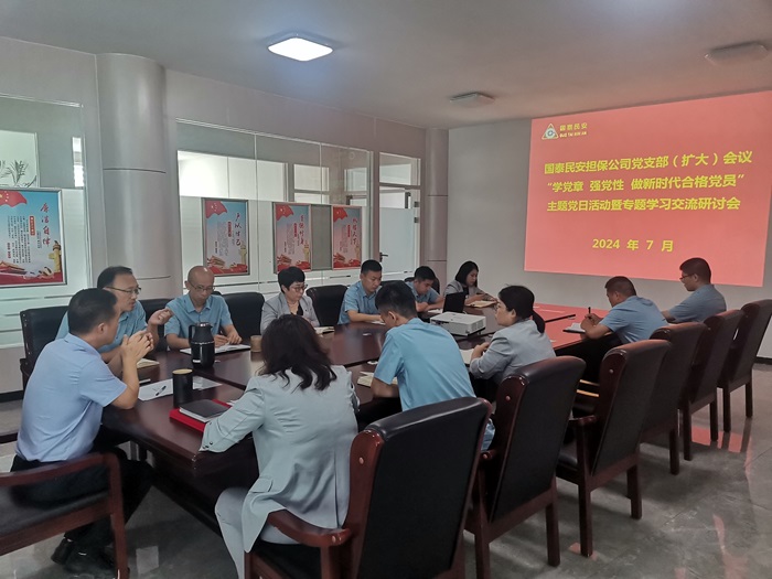 为推进党纪学习教育持续走深走实,进一步引导党员干部学习党章、践行党章,牢固树立宗旨意识、纪律意识,不断提升党性修养,7月26日,国泰民安担保公司党支部开展了“学党章 强党性 做新时代合格党员”主题党日活动,组织党员干部集中学习《中国共产党章程》并专题学习交流研讨。由公司党支部书记、董事长吴雷钢主持会议,公司全体党员干部参加学习。