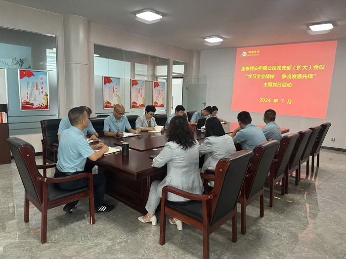 为深入贯彻党的二十届三中全会精神,进一步学习领会中共中央关于进一步全面深化改革、推进中国式现代化的重大决定,统一思想、凝聚共识,推动全会精神在公司落地生根,7月29日,国泰民安担保公司党支部开展了“学习全会精神 争当发展先锋”主题党日活动,组织党员干部集中学习观看了中共中央介绍和解读党的二十届三中全会精神新闻发布会。由公司党支部书记、董事长吴雷钢主持会议,公司全体党员干部参加学习。