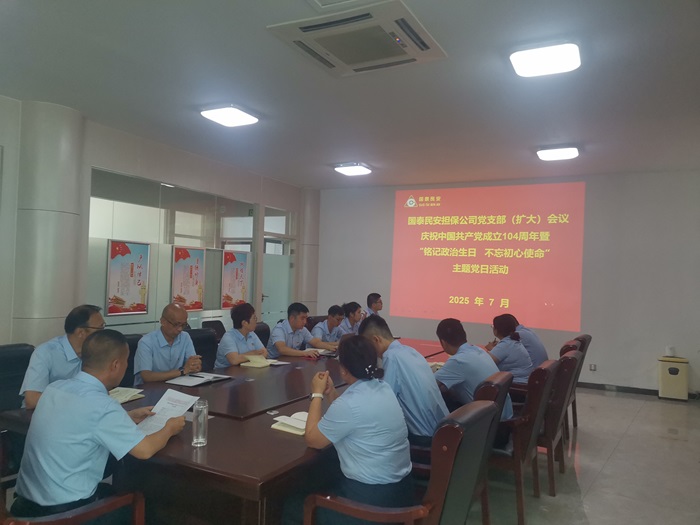 为深入学习贯彻习近平新时代中国特色社会主义思想和党的二十届三中全会精神,持续推进“红色领航•国企敢当”主题实践活动走深走实,进一步引导公司党员干部弘扬伟大建党精神, 传承党的优良作风,激励党员干部员工初心如磐跟党走,担当作为开新局,7月7日,国泰民安担保公司党支部召开(扩大)会议“庆祝中国共产党成立104周年”暨开展 “铭记政治生日•不忘初心使命”主题党日活动,由公司党支部书记、董事长吴雷钢主持会议,公司全体党员干部员工参加学习。